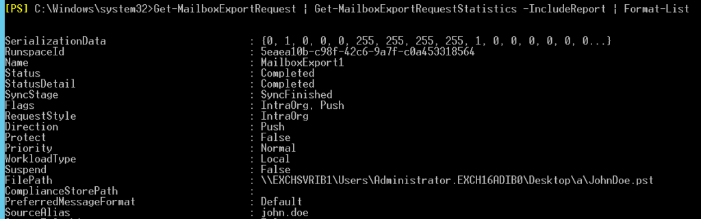 Get-MailboxExportRequest | Get-MailboxExportRequestStatistics -IncludeReport | Format-List