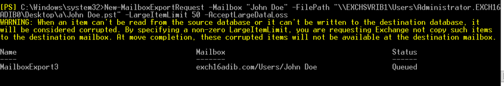 In the above command, we have set the large items limit to 50. This means the export will continue even if the mailbox has up to 50 large items. However, these items will not be exported.