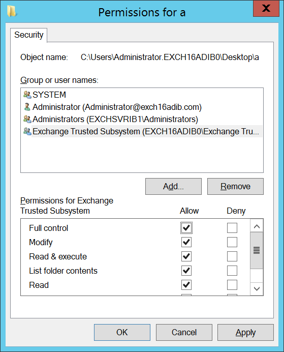Ensure that your user account and Exchange Trusted Subsystem have Full Control permission. If not, check the checkbox in front of Full Control to provide the permission.